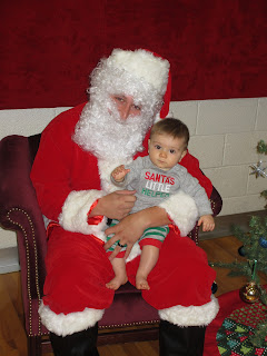 Now all of our ward knows if Santa's beard was real. He checked twice to make sure. Once when he first got on his lap, and once while we took the picture above, ha. From the minute he got on Santa's lap, he was just looking for things to pull or play with. The tree caught his attention next.